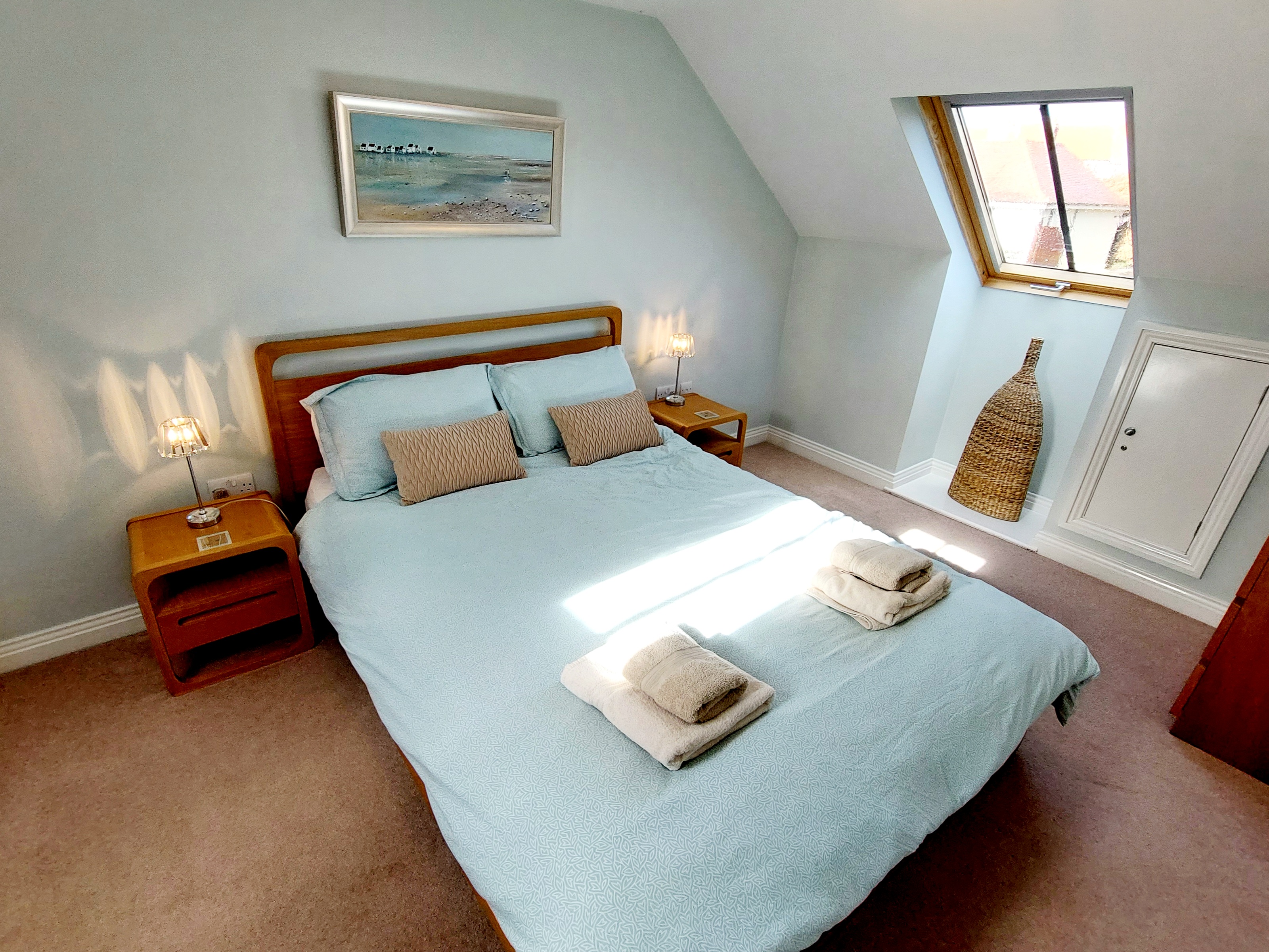 Master Bedroom - Kingsize Bed, TV, two skylight windows.
